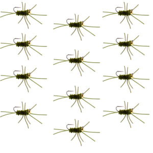 Barbless Pat's Rubber Legs Tungsten Bead Jigged Dark Olive Euro Nymph - Set of 12 Flies Hook Size 10