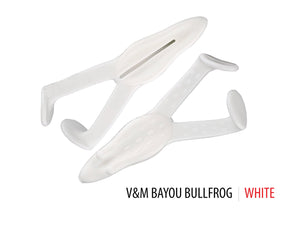 V&M's Bayou Bullfrog is a soft plastic frog packed full of action. It's boot style feet kick aggressively drawing bass out of heavy cover or from long distances in open water. The belly is designed with a tunnel shape to prevent the frog from rolling over upon being retrieved. Rig the Bayou Bullfrog up with a V&M Frog Hook and heavy braid and HANG ON!