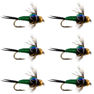 Bead Head Green Copper John Nymph Fly Fishing Flies - Set of 6 Flies Hook Size 16