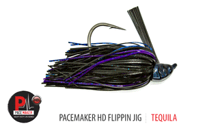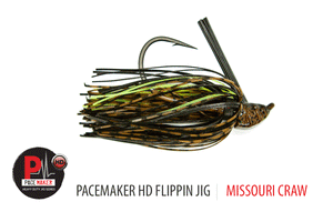 Designed by Bass Pro Tour angler and flipping expert, Cliff Pace, the V&M Pacemaker HD Series Jig offers unmatched, pull your truck out of a ditch power that is made for catching the biggest bass in the heaviest cover. First, it is equipped with a custom made 5/0 Mustad Ultra Point hook that is only bent upward at the line tie and not down the shank of the hook, which allows the head of the jig to sit lower in relationship to the hook point for an ultra wide gap in a compact package. The hook is also 4x strength so that anglers can use the heaviest flipping stick and heaviest line they own and never worry about ever bending the hook out.
