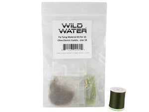 Wild Water's fly tying kits give you all the materials you need to tie a small batch of flies. This kit gives you enough materials and hooks to tie 10 Olive Electric Caddis flies, hook size 16. You will also get a spool of thread and a sample tied fly with this kit.