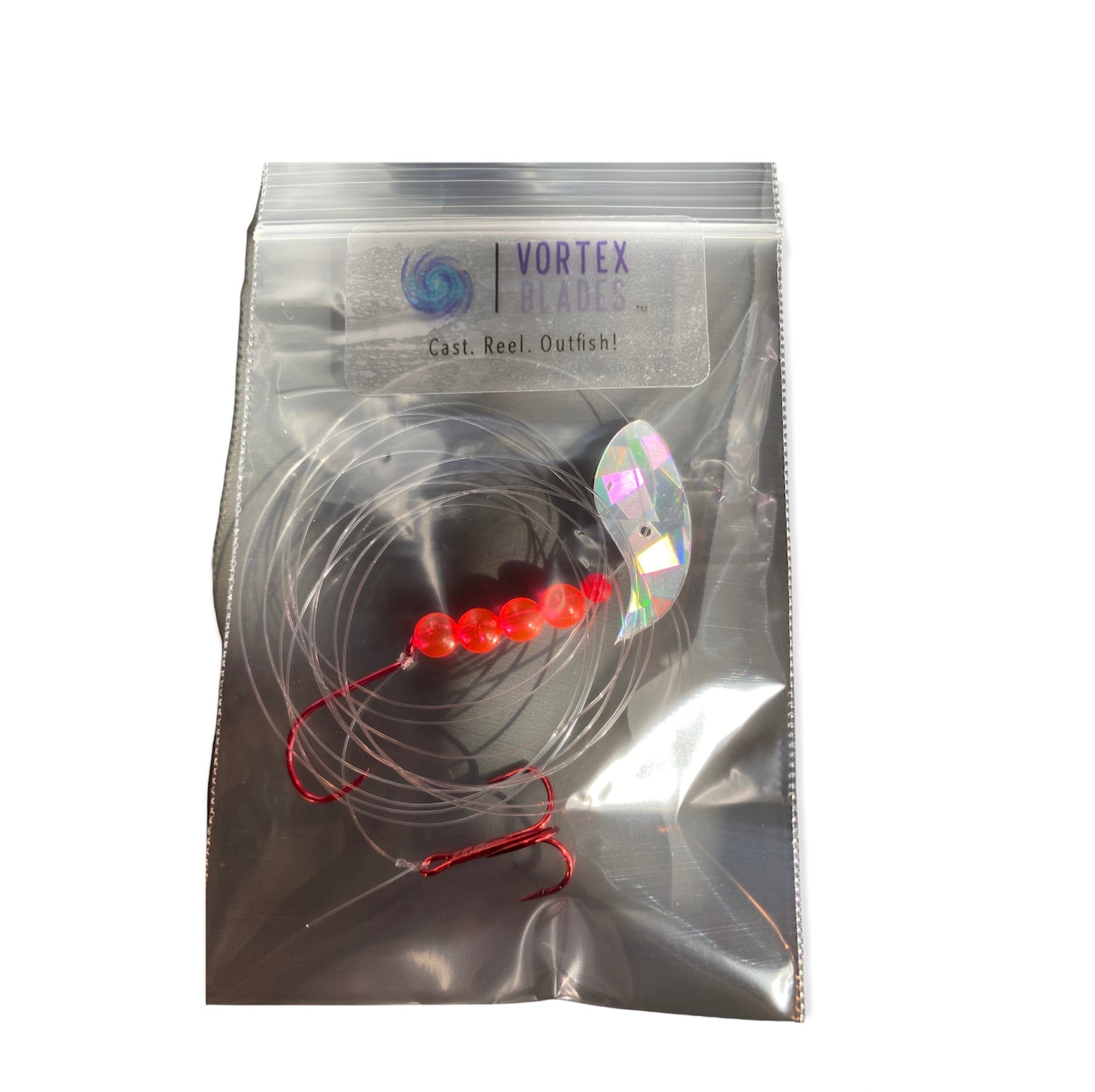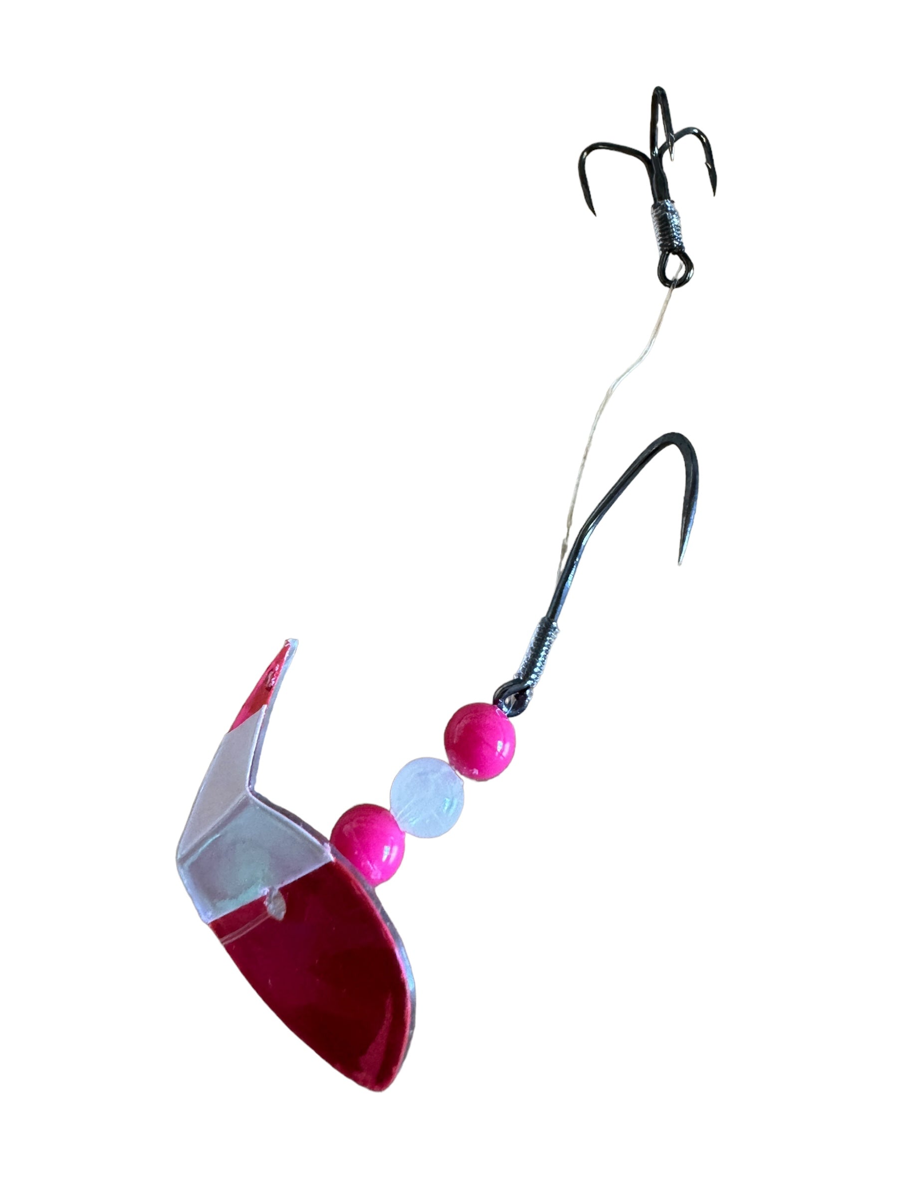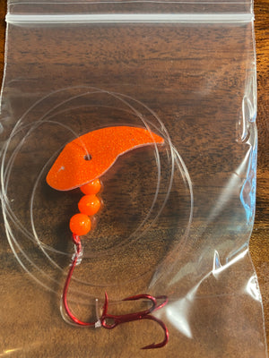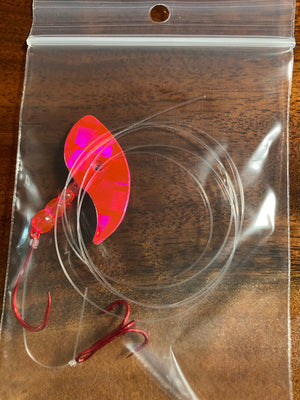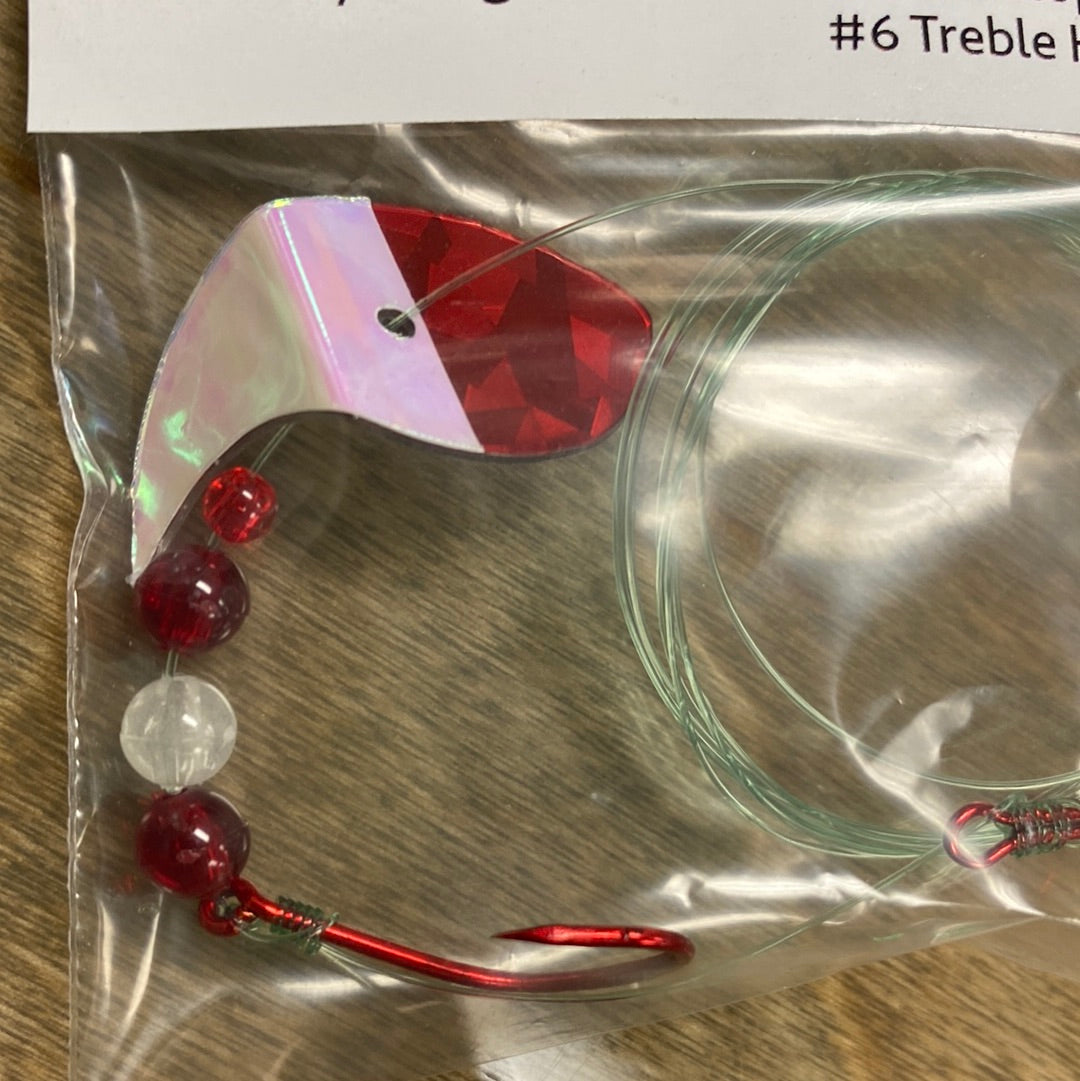 Vortex Sockeye Rig combines a Vortex Blade ™ , size 1/0 octopus hook, and #6 treble hook to create a deadly sockeye lure. The Vortex Blade ™ offers you a wide circular roll if you leave the blade flat. If you choose to bend the blade in the middle it exhibits an enticing wobble action. Have fun choosing which way to bend the blade, forward, backward, and at any angle for different presentations.