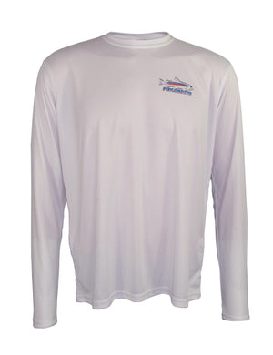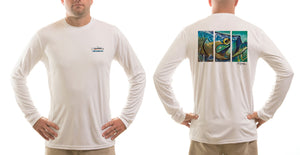 Lightweight sun protective SPF 50 fishing shirts. We place Ed Anderson's "Tarpon Layup" on the back of this white-colored long sleeve T. The Fincognito logo adorns the left chest. 100% polyester with PURE-Tech wicking technology. Our fly fishing apparel works well on the water or as hiking clothes on the trail. Great sun protection, moisture wicking apparel.