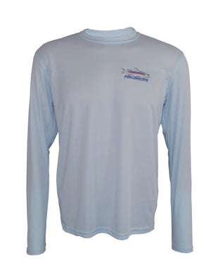 Lightweight sun protective SPF 50 fishing shirts. We place Travis Sylvester's "Freestone" cutthroat trout on the back of this arctic blue-colored long sleeve T. The Fincognito logo adorns the left chest.  100% polyester with PURE-Tech wicking technology. Our fly fishing apparel works well on the water or as hiking clothes on the trail. Great sun protection, moisture wicking apparel.