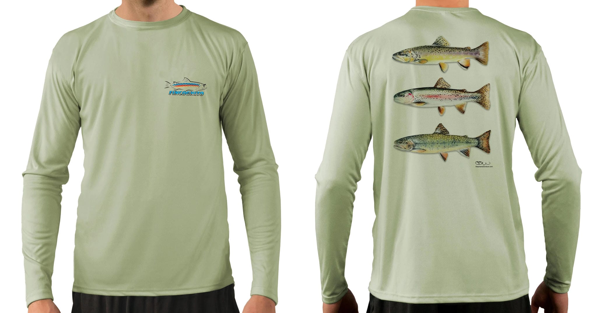 Lightweight sun protective SPF 50 fishing shirts. We place Stephanie Sondock's "Trout Trio" on the back of this sage green-colored long sleeve T. The Fincognito logo adorns the left chest. 100% polyester with PURE-Tech wicking technology. Our fly fishing apparel works well on the water or as hiking clothes on the trail. Great sun protection, moisture wicking apparel.