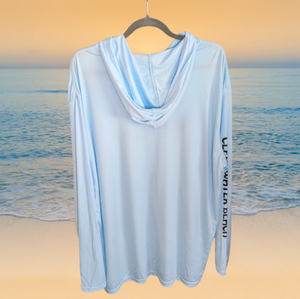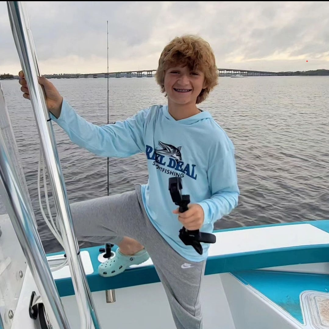 ¡Combina tu pasión por la pesca con ropa de alto rendimiento! Nuestra camiseta con capucha Reel Deal es ligera y de secado rápido, con protección SPF-50 para todas tus excursiones al aire libre. Además, luce un llamativo logo de barracuda Reel Deal en la parte delantera y una manga con el logo de Clearwater Beach. Disponible en azul claro.