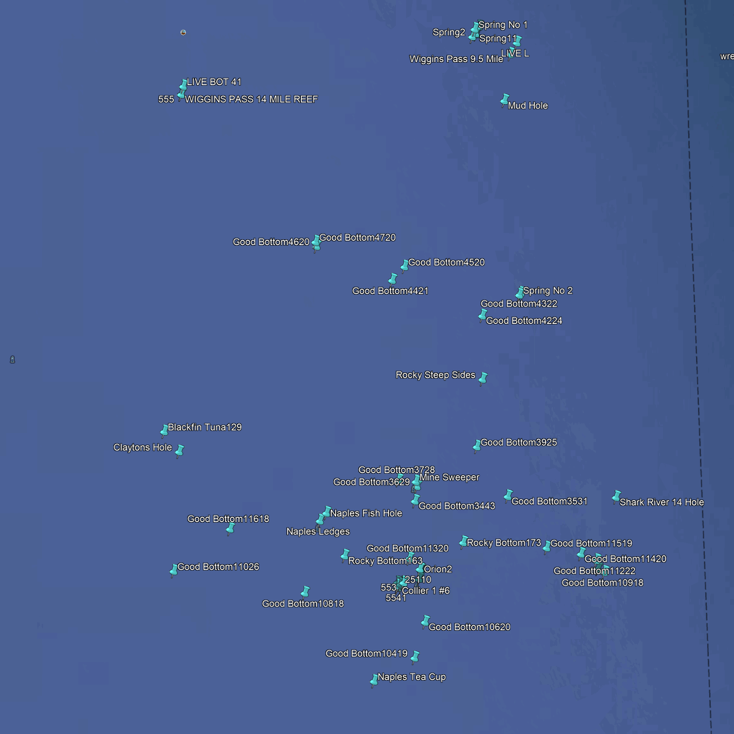 Ce forfait comprend 801 sites de pêche situés à moins de 16 kilomètres des côtes sud-ouest de la Floride, entre Cape Coral et Naples. Ces sites s'étendent des zones côtières, des criques et des baies jusqu'à 16 kilomètres au large.