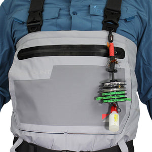 • Les bretelles sont réglables et fabriquées en sangle élastique de haute qualité. Elles comportent deux points d'attache pour un accès rapide aux accessoires essentiels de la pêche à la mouche, comme des pinces coupantes ou des pinces hémostatiques.