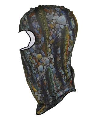 Our Fin-Flank Sun Masks provide extreme sun protection.  Wear for anatomically correct full head coverage or around your neck as a gaiter.  We present "Trout Dreams" by Josh Udesen on this cooling wicking poly-Spandex Sun Mask.