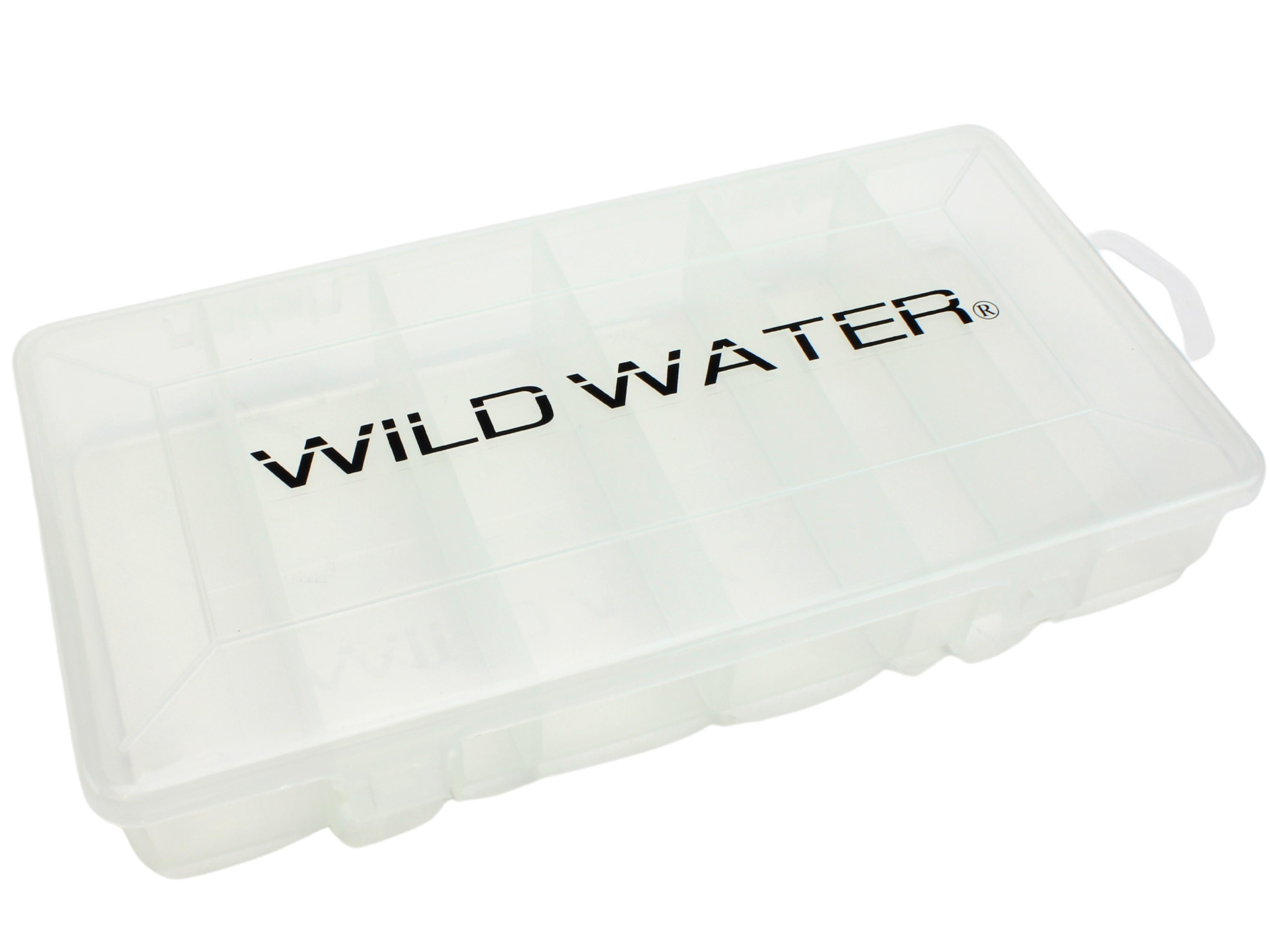 Wild Water's Large 6 section clear fly box is big enough to hold your largest flies with ease! This extra-large fly box measures 8" wide, 4" deep and 1" high and is made of sturdy clear plastic with Wild Water's logs on the top.