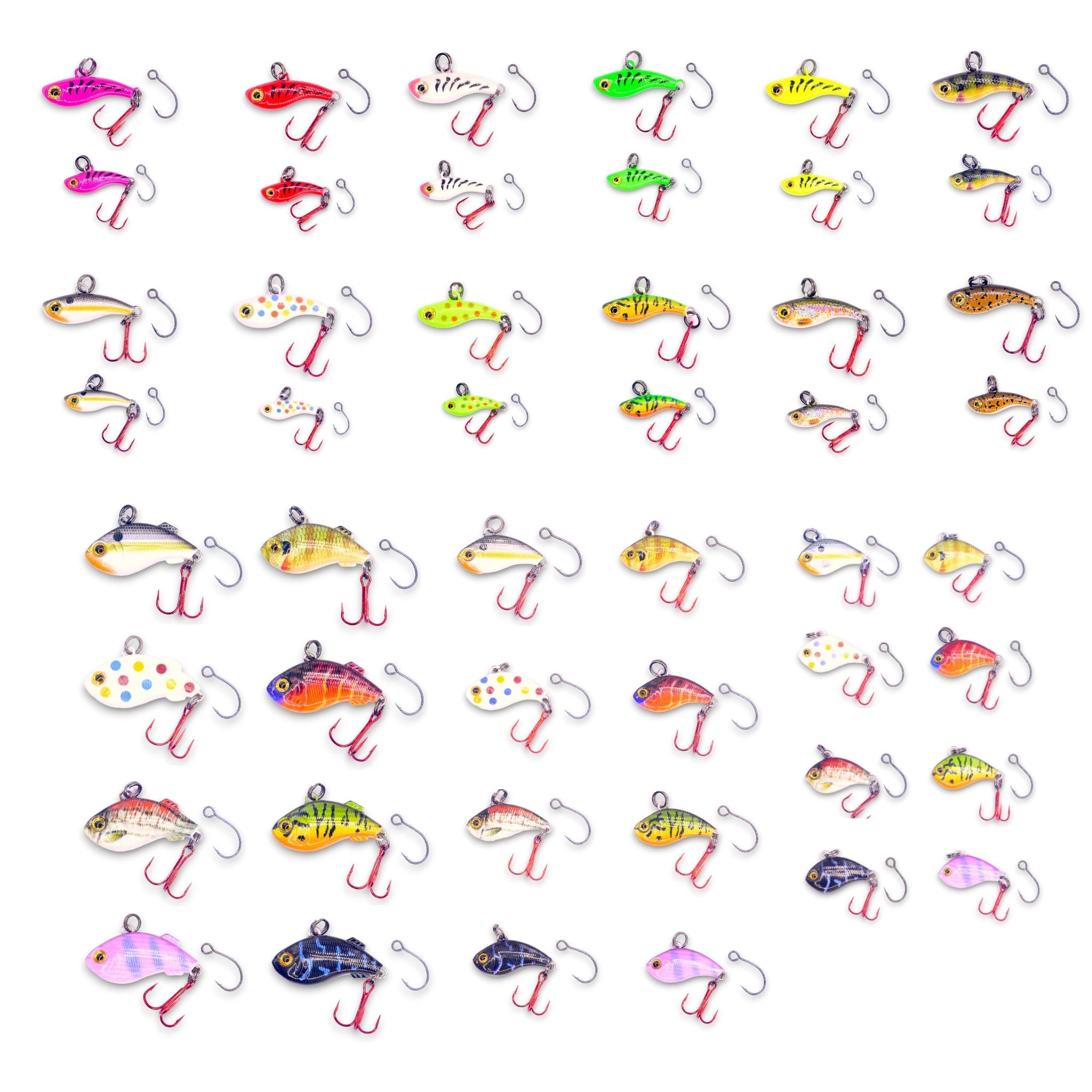 Snag the quick grab master pack with 1 of each size and color of our Tungsten T-Rips (24 total lures) and 1 of each size and color of our K-Rips. These little mini vibe lures are awesome for vertical jigging, pitching, fishing under a float and for hammering panfish.